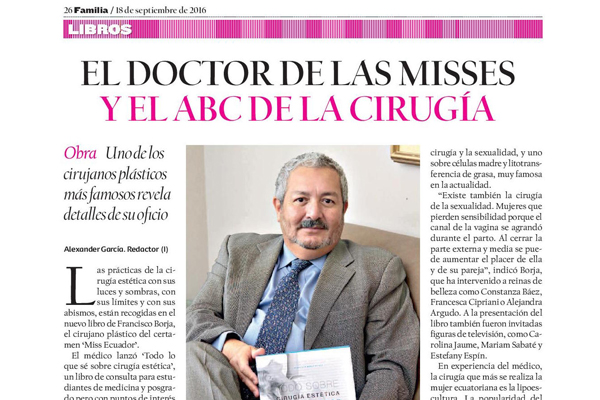 En las cuatro ediciones de su libro TODO SOBRE CIRUGÍA ESTÉTICA, describe doce técnicas inéditas, de relevancia social y científica. Como Cirujano Plástico del certamen de belleza Miss Ecuador, ha obtenido varios reinados del Ecuador y el Continente, desde 2004 hasta la actualidad y, el Vicereinado Miss Universo 2013. Sus innumerables conferencias en América, Europa y Asia, lo consolidan como uno de los mayores referentes en Cirugía Plástica del Ecuador.